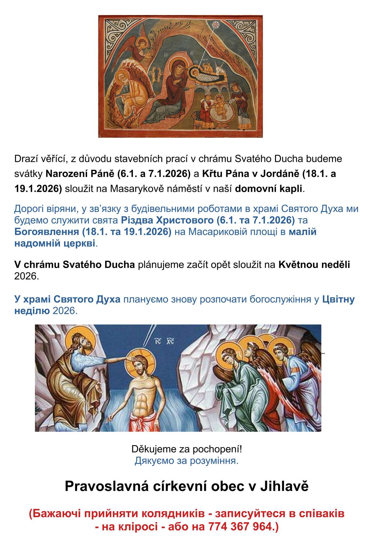 Při liturgiích (koncem bohoslužby - po 11,30 hod.) se zpívají vánoční koledy, které zde přednášíme v pěti jazycích.