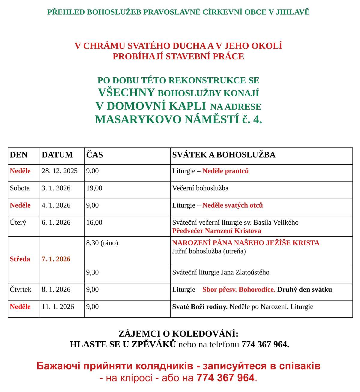 Z důvodů stavebních prací kolem chrámu v parku se zatím všechny bohoslužby konají v domovní kapli na Masarykově náměstí č. 4 v Jihlavě.